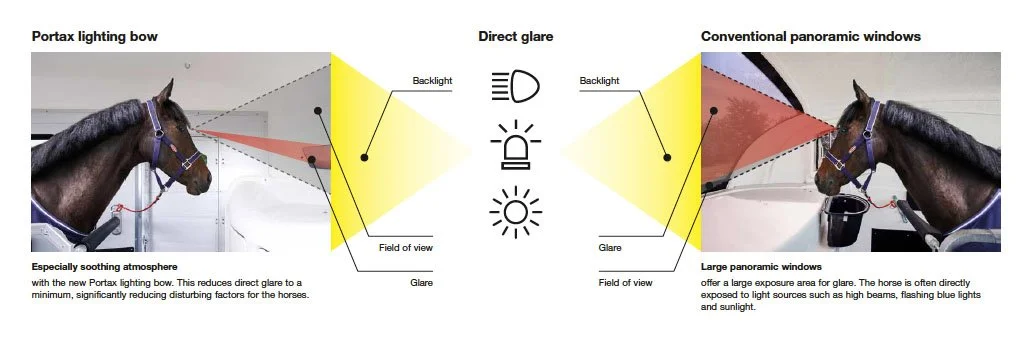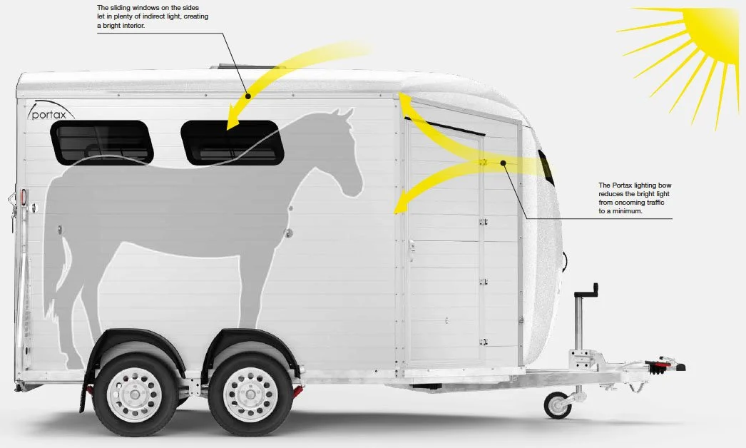 The new front window reduces the direct glare to a minimum, which significantly reduces disturbing factors for the horse such as lights from oncoming traffic, sun glare and emergency vehicle lights. The side sliding windows, the air vent and the new front window create a large window area and ensure excellent ventilation and optimal stress-free transport for your horse.