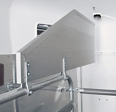 Full height walk-in airtight and fully sealed tack room with two saddle racks, 7 bridle hooks, mirror, shovel & brush, net, 2 feed buckets and feed bucket holders, foldable seat, whip holder, 2 shelves for rugs and interior lighting - self draining and well ventilated